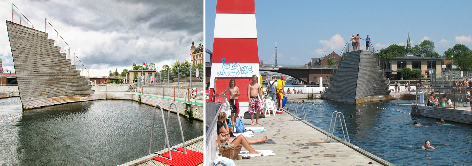 В 2003 году в самом центре Копенгагена, расположенного на островах, был построен первый общественный пляж. Для этого власти выделили пространство одного из городских каналов. Архитектор Бьярке Ингельс разработал оригинальную конструкцию пляжа-бассейна с деревянными настилами, трамплинами для прыжков в воду и зонами отдыха с укрытиями от ветра.