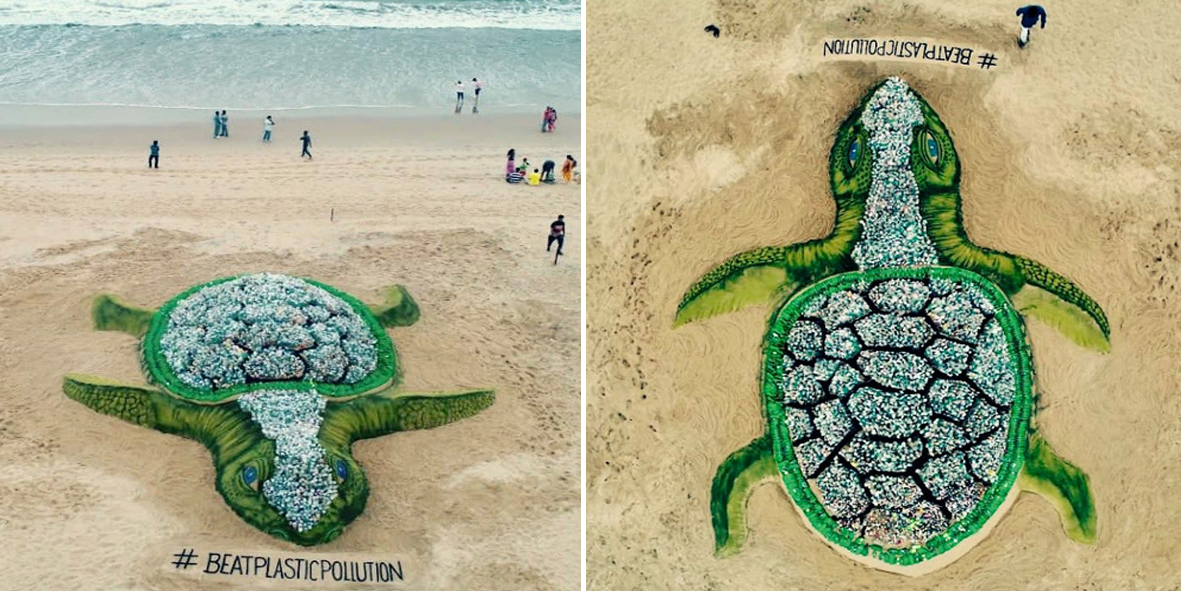 Художник Сударсан Паттнаик, живущий в Одише (Индия), как и многие современные люди старается проявлять заботу об окружающей среде. Своим творчеством он решил воздействовать на умы людей прямо на пляже. Этот индийский художник известен своими песчаными скульптурами, хотя на сей раз он не ограничился только песком. Сударсан дополнительно использовал пластиковые бутылки, которые люди выбрасывают в море и оставляют на пляже, и сделал скульптуру черепахи. Мало того, что результат получился очень красивым, он ещё и напоминает зрителям о том, что мусор, выброшенный в воду, наносит морским обитателям непоправимый вред.