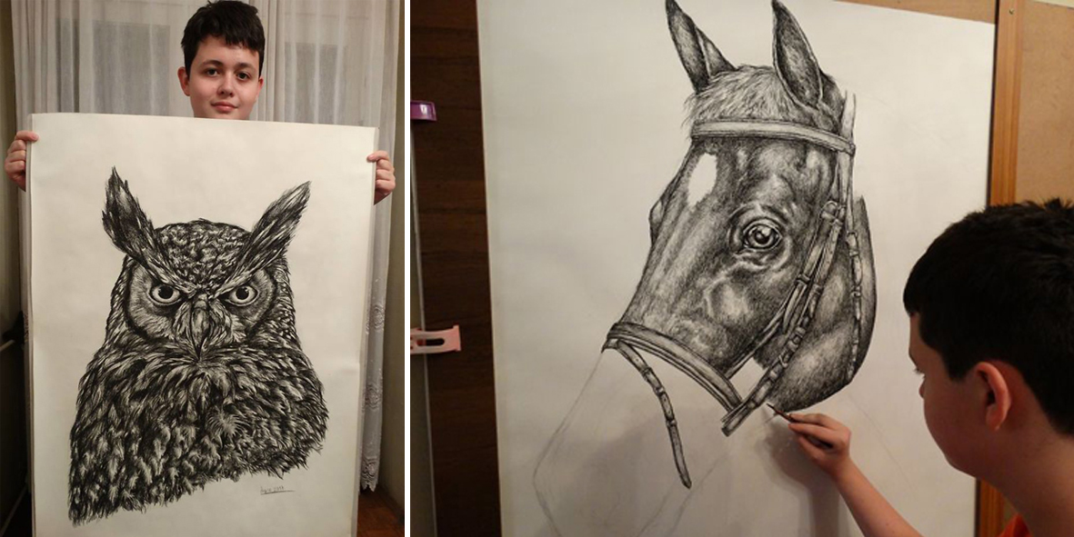 Юный художник-вундеркинд создает реалистичные портреты животных по памяти