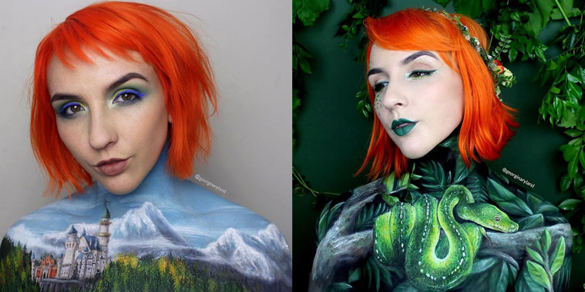 Джорджина Райленд, визажист и бьюти-блогер из Австралии, создаёт невероятный боди-арт, используя в качестве холста собственное тело. Впечатляющие примеры боди-арта встречаются нередко, но работы Джорджины отличаются тем, что она рисует картины не на моделях, а на самой себе, и это очень сложно. Художественный процесс включает в себя зеркало, твёрдую руку и огромное терпение. Женщина не считает, что отличается каким-то особенным талантом, но признаётся, что может похвастаться огромным опытом в боди-арте, это и позволяет ей рисовать замысловатые изображения. Картины Джорджины периодически появляются в разных модных журналах, плюс художница не забывает радовать своих поклонников в социальных сетях. Более 50000 человек любуются творчеством женщины, а также с интересом смотрят её видеоуроки.